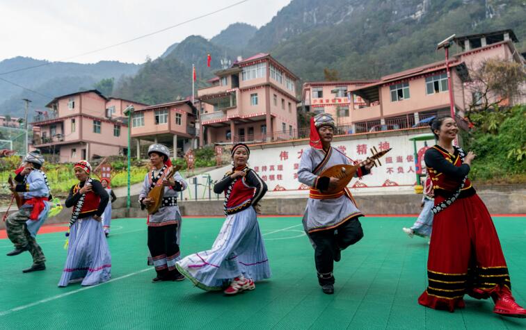 2月22日, 怒江傈僳族自治州福貢縣鹿馬登鄉亞坪村村民在廣場表演傈僳族舞蹈。近年來,云南省怒江傈僳族自治州在鞏固拓展脫貧攻堅成果同鄉村振興有效銜接的過程中,實施鄉村振興“百千萬”示范工程,打造宜居宜業村莊,在青山綠水間建好鄉村,留住鄉愁。