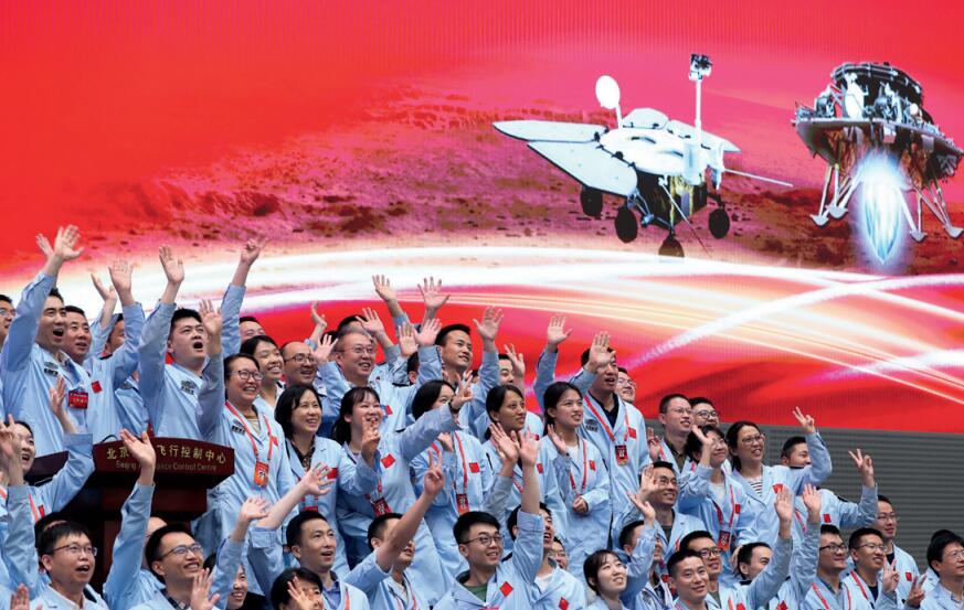 北京航天飛行控制中心青年科技人才群體慶祝我國首次火星探測任務著陸火星成功(2021年5月15日攝)