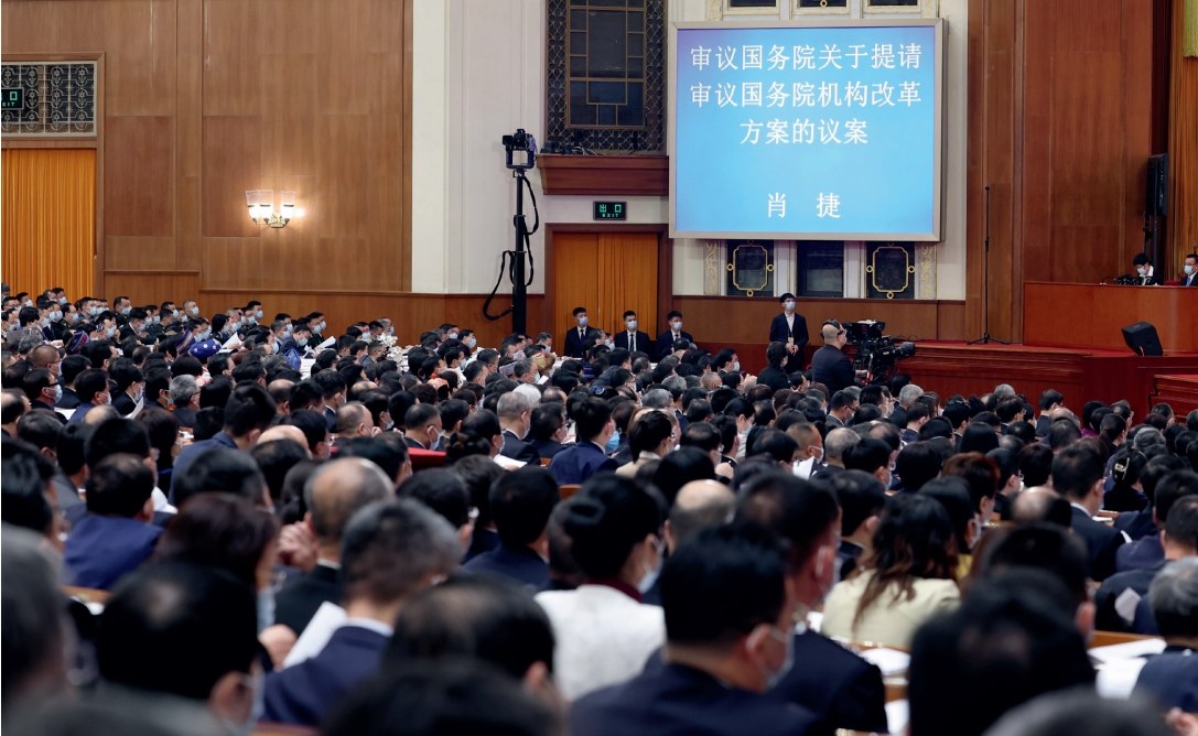 >> 3月7日,十四屆全國人大一次會議在北京人民大會堂舉行第二次全體會議。受國務院委托,國務委員兼國務院秘書長肖捷作關于國務院機構改革方案的說明。