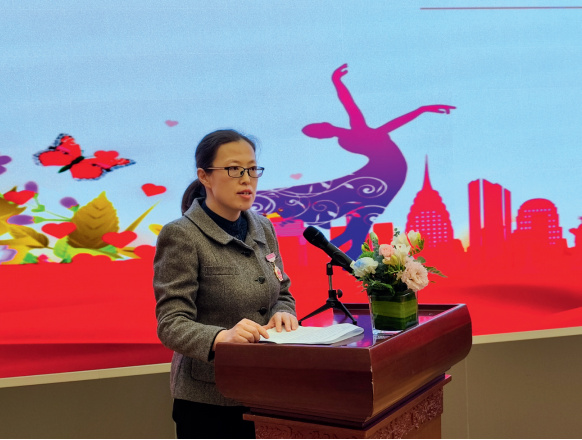 楊愛珍在生態環境部三八婦女節紀念活動中作報告。