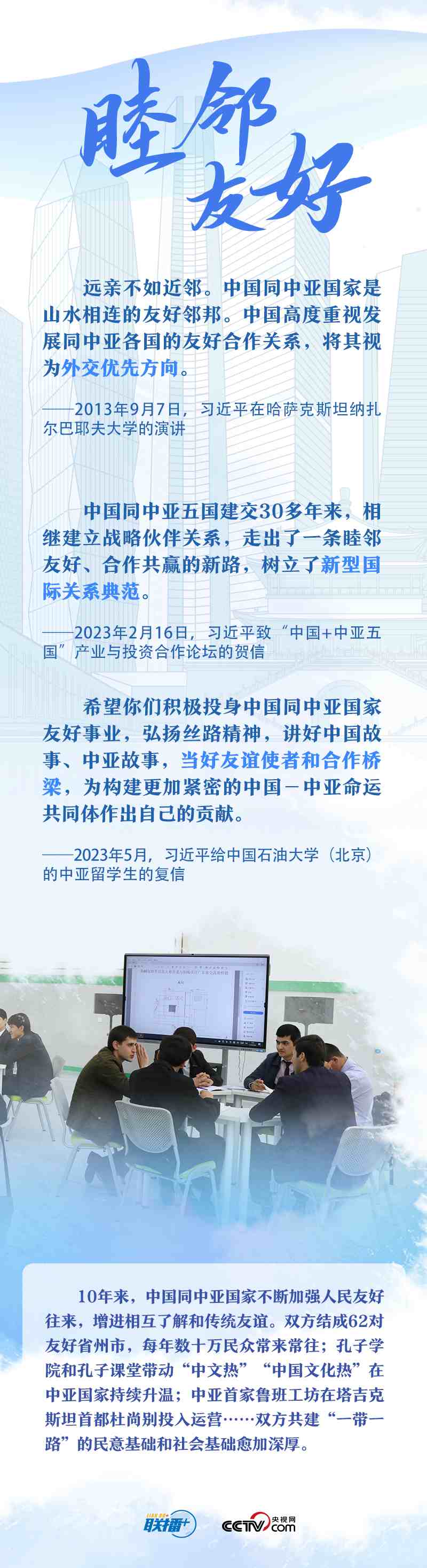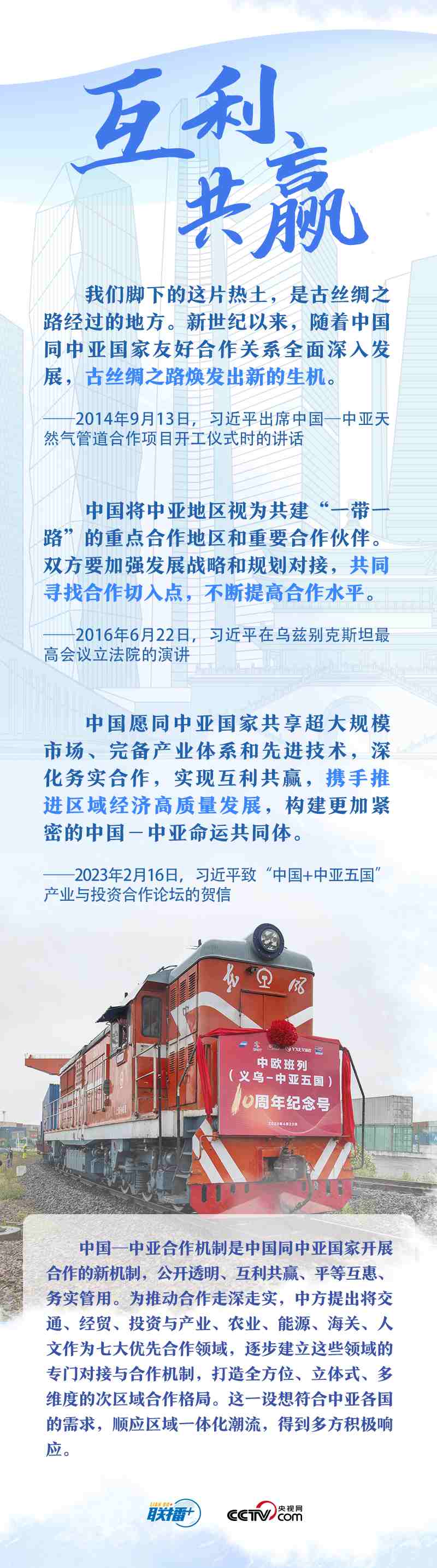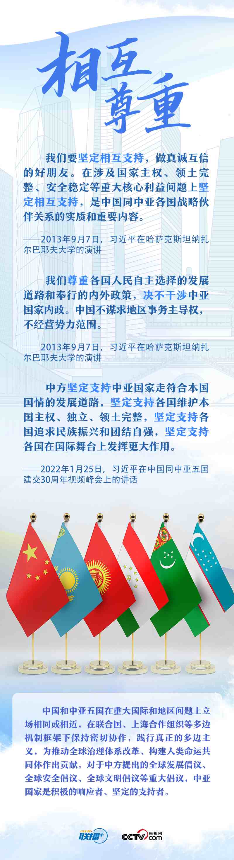 習主席把中國同中亞五國合作的成功密碼總結為“相互尊重、睦鄰友好、同舟共濟、互利共贏”。他強調,這四項原則是在合作中積累的寶貴經驗和共同財富,是中國同中亞國家關系行穩致遠的政治保障,也是中國同中亞國家友好交往繼往開來的力量源泉。