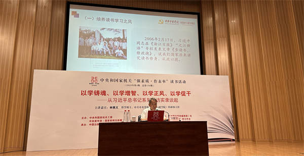 為推動中央和國家機關在學習貫徹習近平新時代中國特色社會主義思想主題教育中走在前、作表率,6月10日,中央和國家機關“強素質·作表率”讀書活動2023年第4期在京舉辦。哲學博士、中央黨校(國家行政學院)科研部主任林振義以《以學鑄魂 以學增智 以學正風 以學促干——從習近平總書記系列采訪實錄談起》為題作主題講座。中央和國家機關各部門黨員干部300余人參加活動,現場氣氛熱烈,座無虛席。
