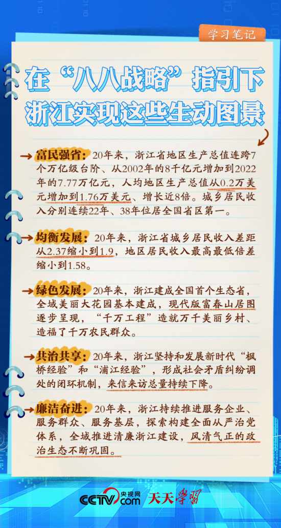在浙江工作期間,時任浙江省委書記的習近平在深入調查研究和系統謀劃的基礎上作出 “八八戰略”決策部署,為浙江留下了一份寶貴“戰略資產”。二十年來,“八八戰略”成為浙江發展的“金鑰匙”,指引浙江實現了從經濟大省向經濟強省、從對內對外開放向深度融入全球、從總體小康向高水平全面小康的躍升。