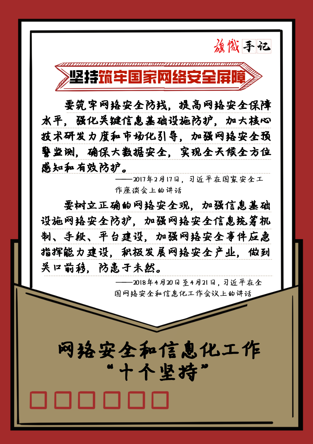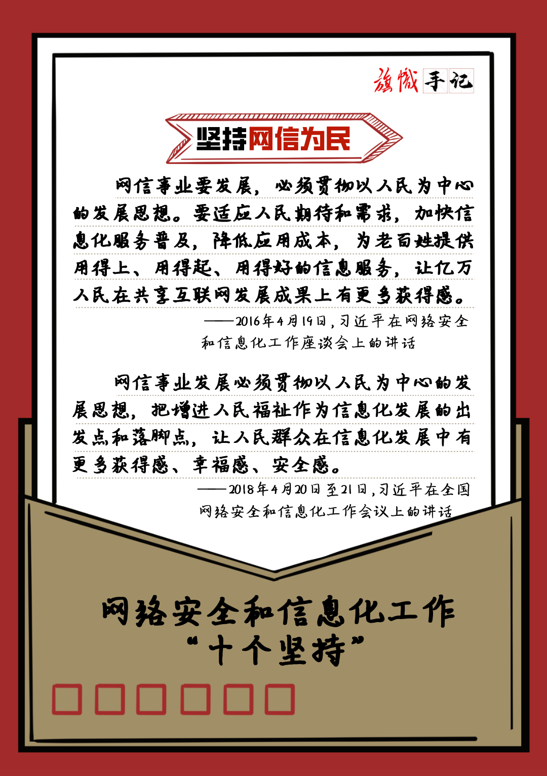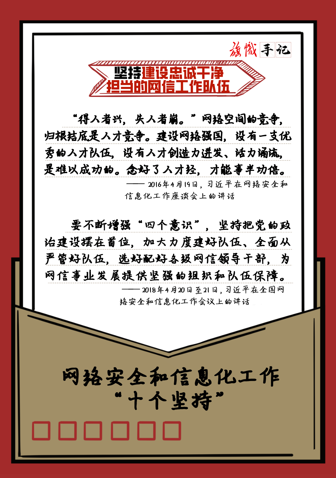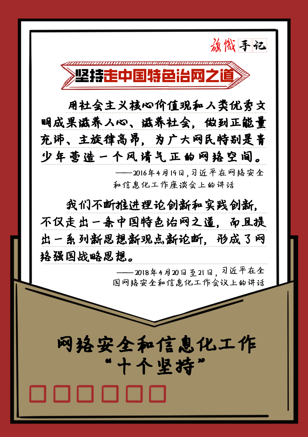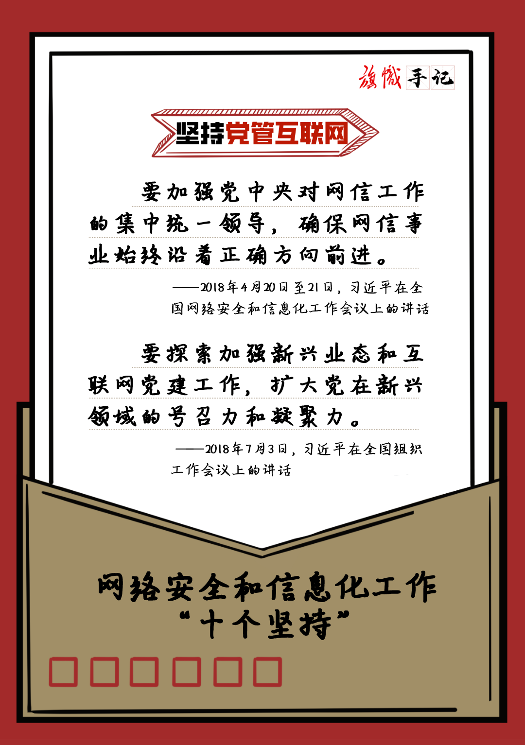 近日,習近平總書記對網絡安全和信息化工作作出重要指示,強調要堅持黨管互聯網、堅持網信為民、堅持走中國特色治網之道、堅持統籌發展和安全等“十個堅持”。我們以“旗幟手記”的形式進行了梳理,供交流學習。