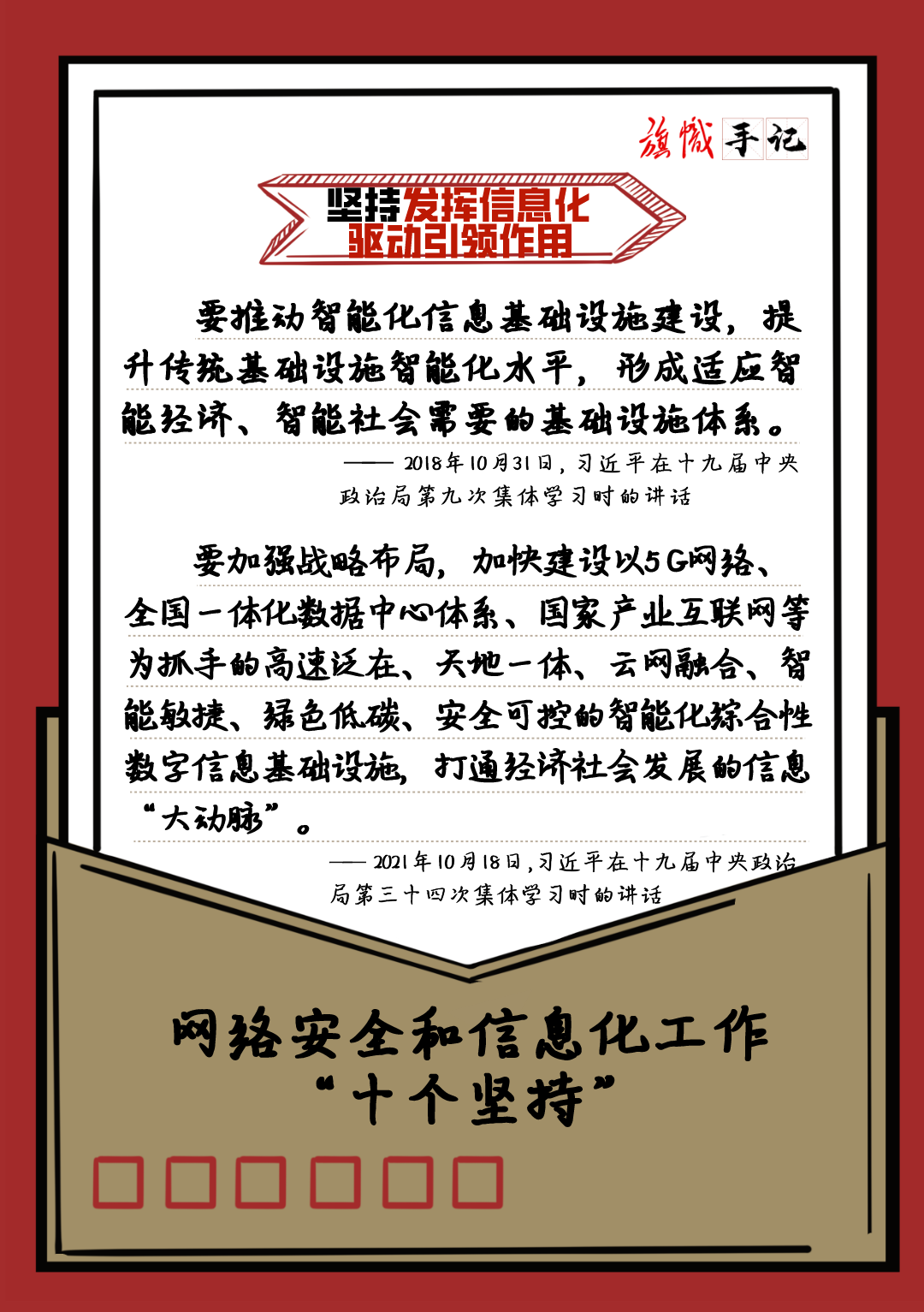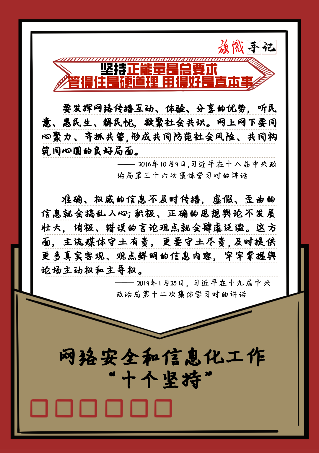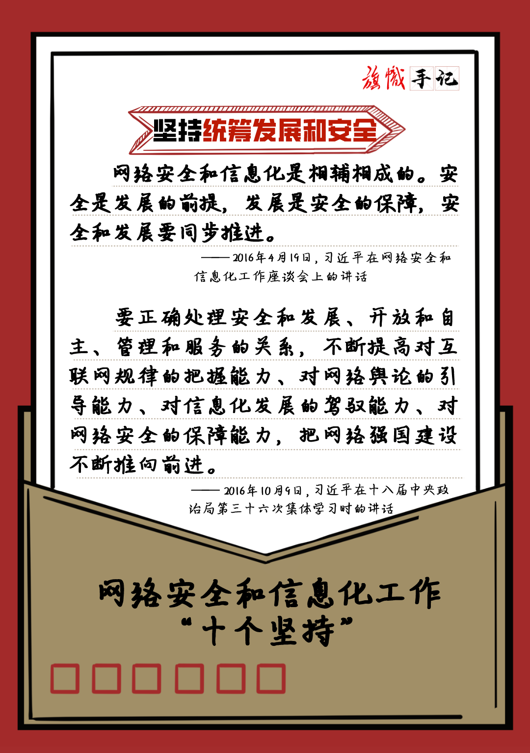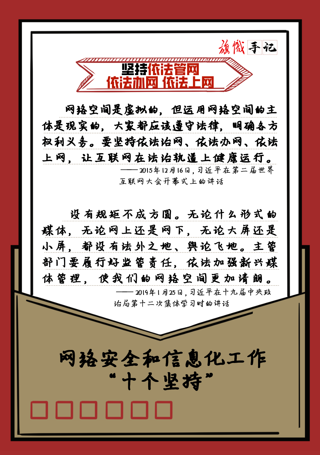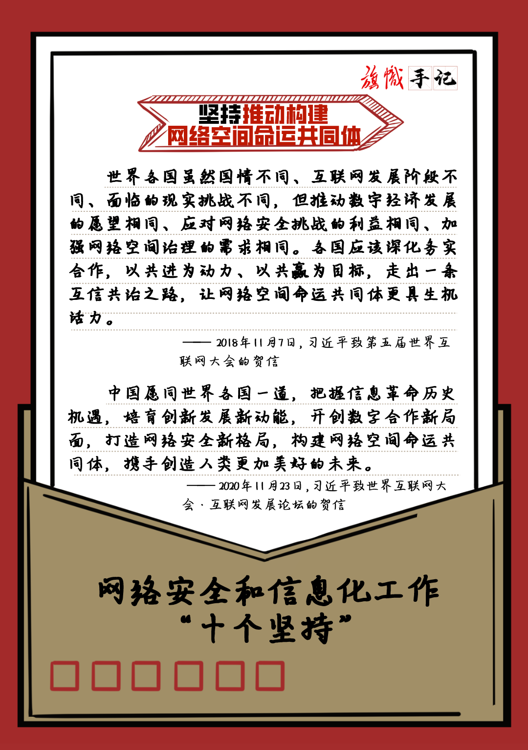 近日,習近平總書記對網絡安全和信息化工作作出重要指示,強調要堅持黨管互聯網、堅持網信為民、堅持走中國特色治網之道、堅持統籌發展和安全等“十個堅持”。我們以“旗幟手記”的形式進行了梳理,供交流學習。