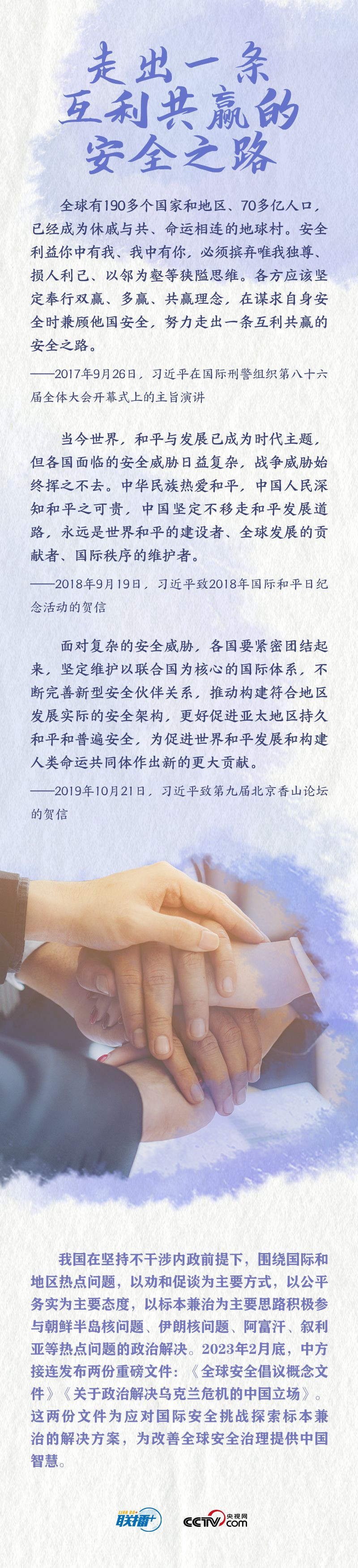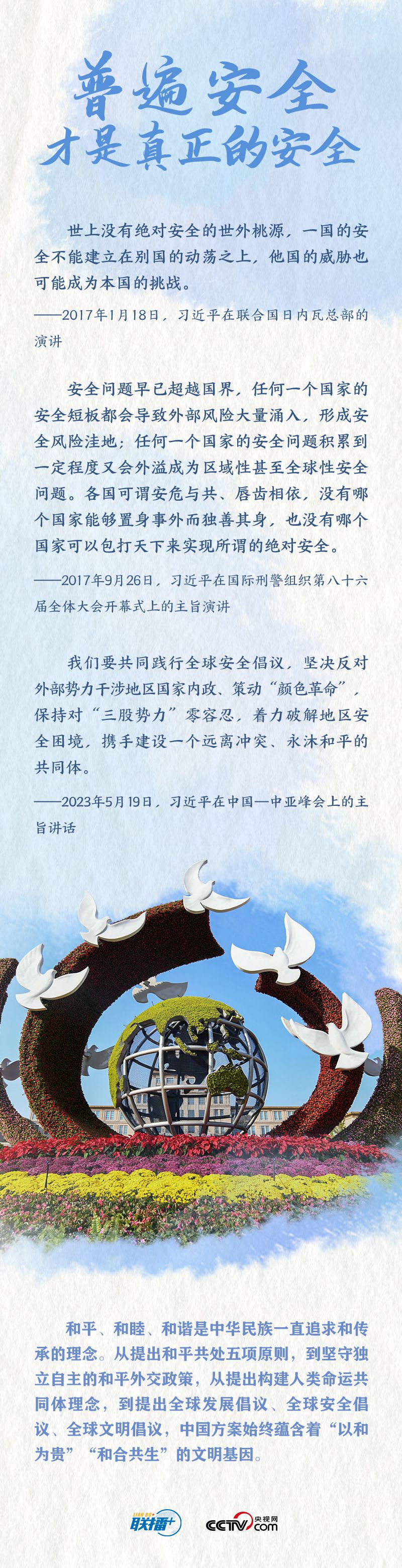 從2014年在亞信第四次峰會上提出亞洲安全觀,到2016年在二十國集團杭州峰會期間闡述中國的新安全觀,從2017年在聯合國日內瓦總部闡述如何建設持久和平、普遍安全的世界,到2022年提出全球安全倡議,習近平主席深刻洞察世界發展大勢,不斷發展和完善具有中國特色的安全理念,為破解全球安全困境指明前進方向、明確合作路徑。