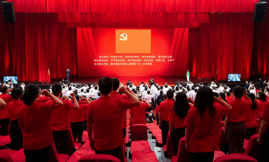 >> 7月3日,中央廣播電視總臺隆重舉辦“學思想 強黨性 重實踐 建新功——慶祝中國共產黨成立102周年主題黨日”,120名新黨員進行入黨宣誓,老黨員重溫入黨誓詞。