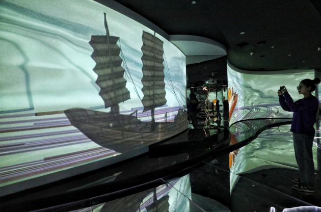 2023年10月25日,江蘇省張家港市黃泗浦生態公園長江文明數字館,觀眾在參觀“江海奇幻游——長江文明與海上絲綢之路”開放式博物館特展。