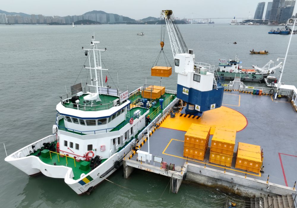 2024年1月25日,工作人員在廈門西堤海上環衛碼頭吊運海漂垃圾(無人機照片)。新華社記者 林善傳 攝