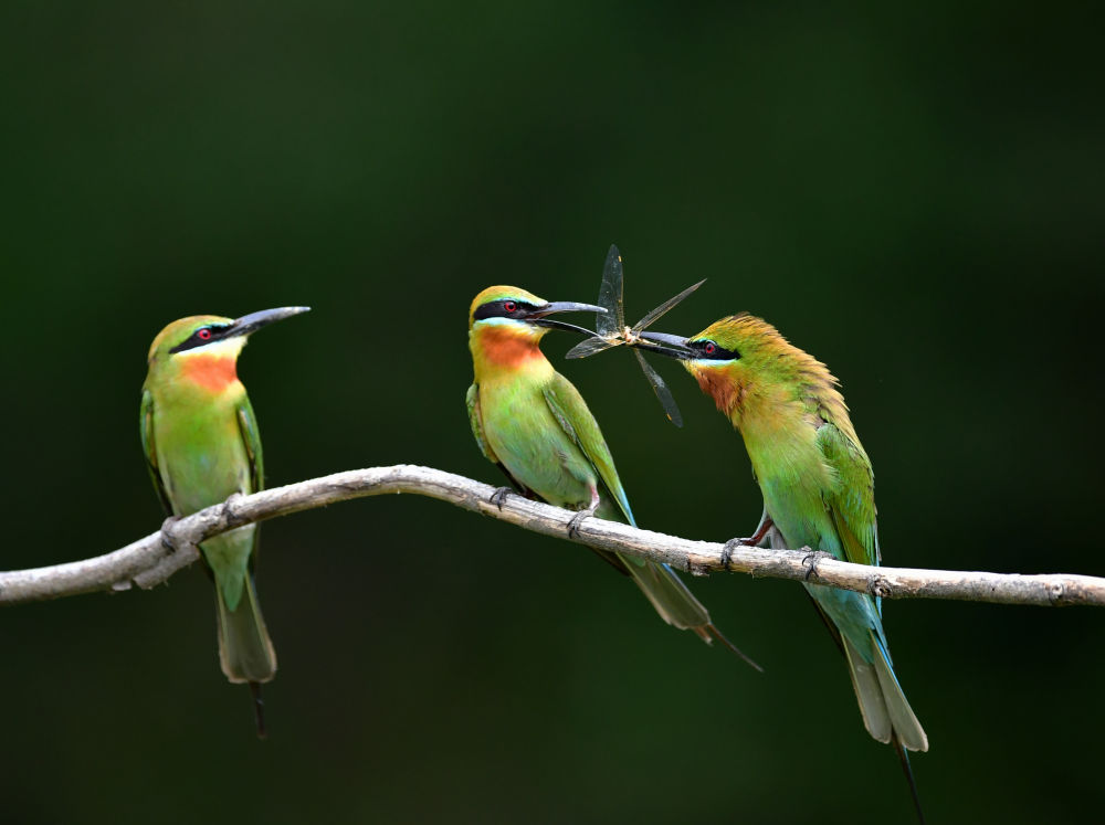 在廈門五緣灣栗喉蜂虎自然保護區騎馬山片區,一只栗喉蜂虎雄鳥(右)給兩只雌鳥喂食昆蟲(2023年5月20日攝)。新華社記者 魏培全 攝