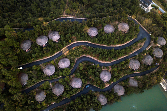 >> 浙江省湖州市德清縣筏頭鄉“裸心谷生態度假村”俯瞰,這里有以低碳理念興建的“森林度假夯土小屋”建筑群。