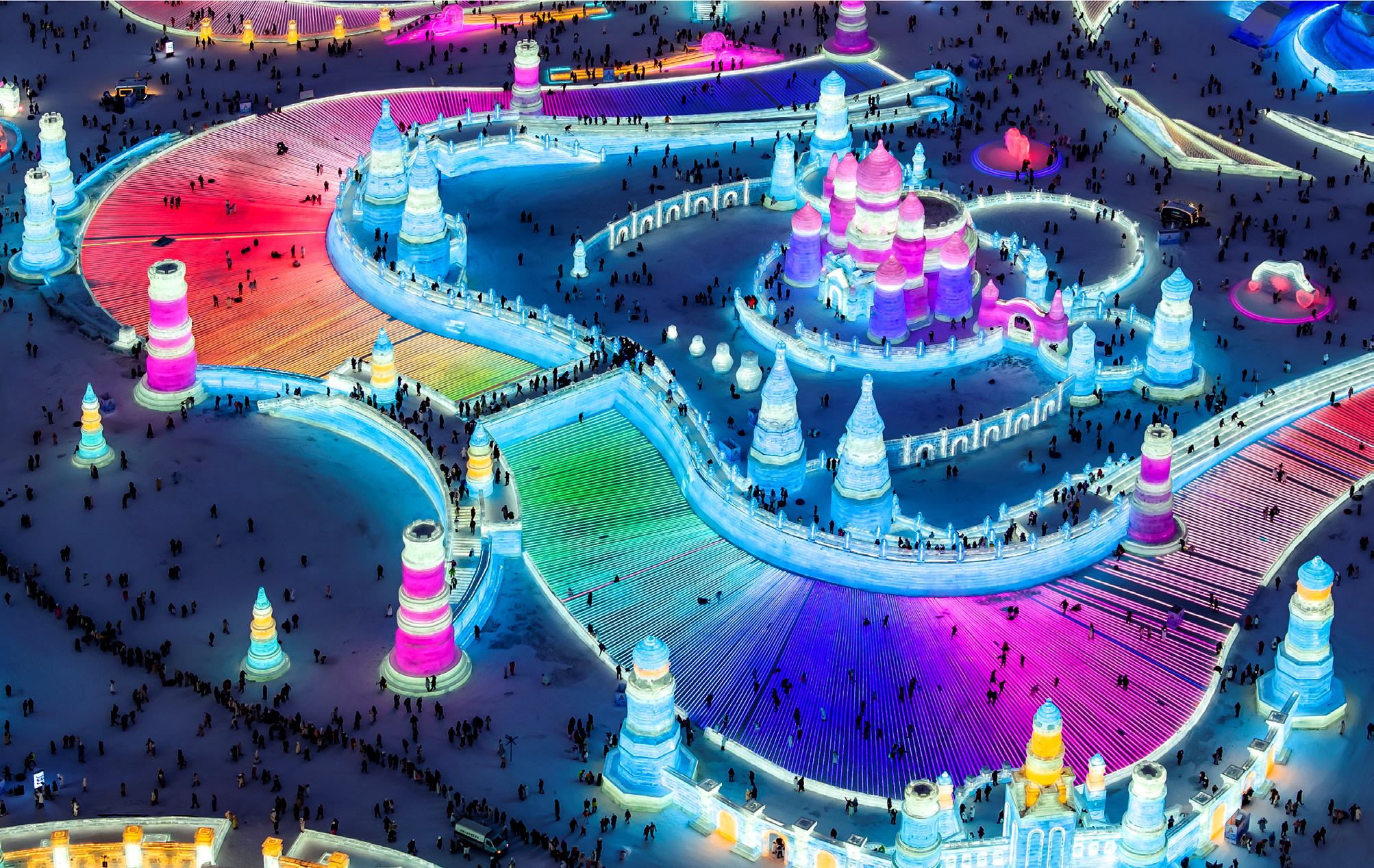 >> 2023年12月17日,黑龍江哈爾濱,第二十五屆哈爾濱冰雪大世界華燈璀璨,吸引眾多游客觀光賞燈。