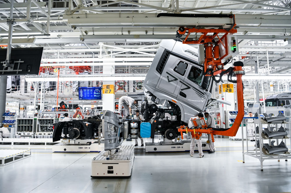 在位于吉林長春的一汽解放汽車有限公司J7智能工廠內,工人在AGV(搬運機器人)上裝配車輛(2023年6月12日攝)。新華社記者 顏麟蘊 攝