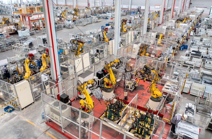 2024年1月8日,在位于浙江省湖州市長興經濟技術開發區的長興地通汽車部件有限公司,全自動機器人高速運轉生產新能源汽車配件訂單產品(無人機照片)。新華社發(譚云俸攝)