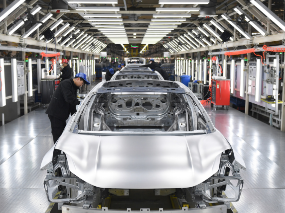 >> 2024年1月22日,工人在位于浙江寧波的極氪智慧工廠檢查焊裝的新能源車架。