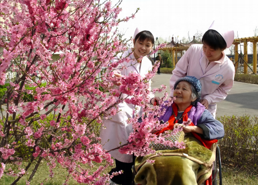 >> 山西省老年公寓護理人員陪同老人在院內賞花。