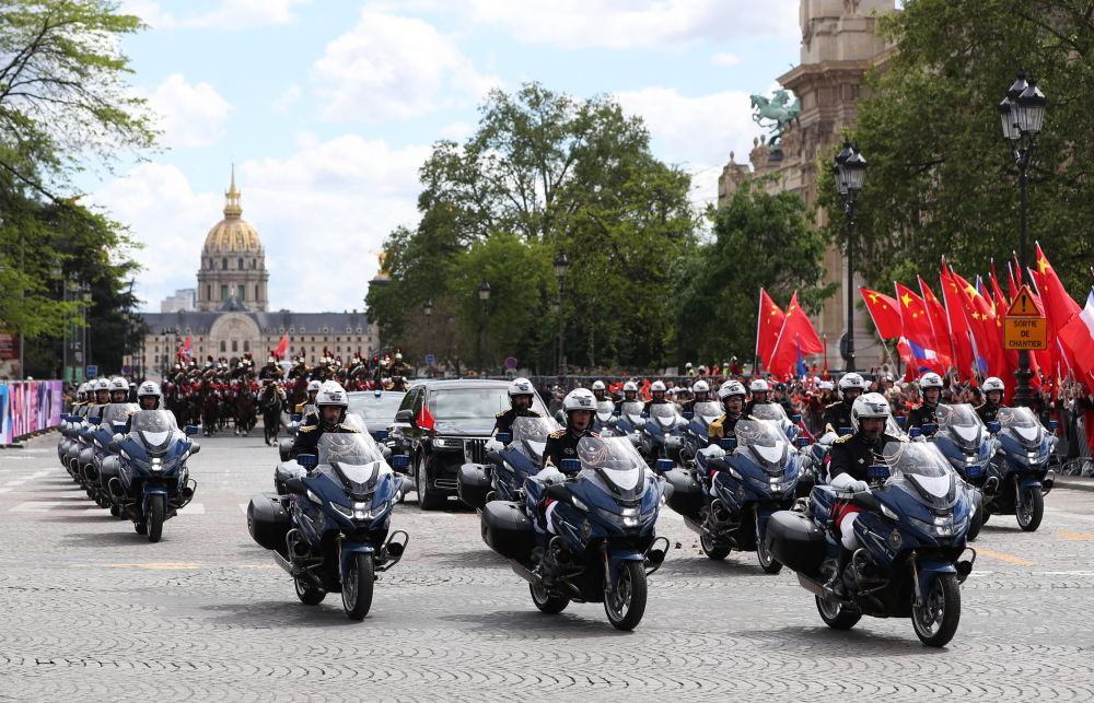 當地時間5月6日下午,正在法國進行國事訪問的國家主席習近平在巴黎出席法國總統馬克龍舉行的隆重盛大歡迎儀式。這是歡迎儀式后,習近平和夫人彭麗媛在共和國衛隊148名騎兵組成的禮兵馬隊和摩托車隊護衛下,乘車前往愛麗舍宮。新華社記者 高靜 攝