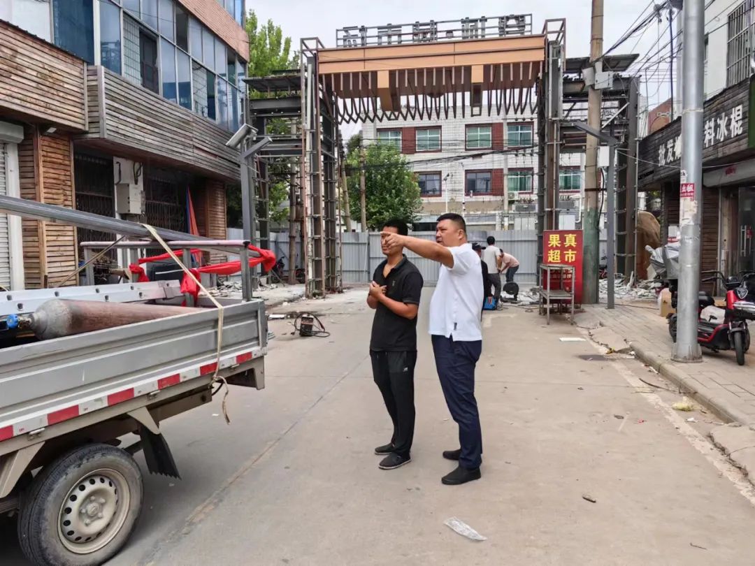 胡軍紅(右)對菜市場改造提升施工進行指導。