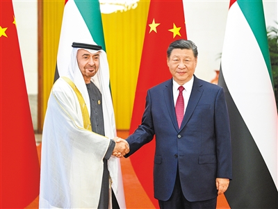 習近平指出,阿聯酋是中國重要的全面戰略伙伴。近年來,在我們共同引領下,中阿關系保持良好發展勢頭,樹立了新時期中國和阿拉伯國家關系的典范。今年是中阿兩國建交40周年,是中阿關系承上啟下、繼往開來的重要節點。中方愿同阿方一道,繼續從戰略高度和長遠角度牢牢把握兩國關系大方向,確保中阿全面戰略伙伴關系始終蓬勃發展。