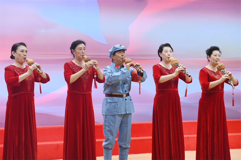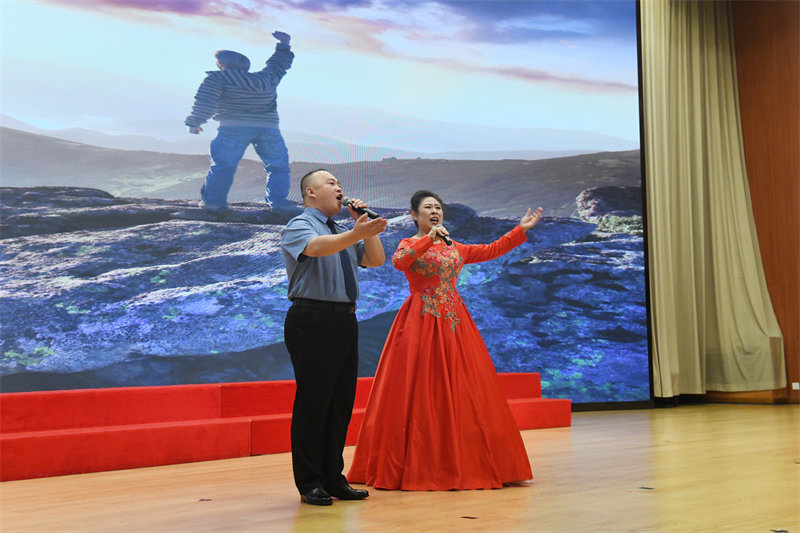 下午的正式演出以歌頌偉大祖國、贊美偉大共產黨為主旋律,在飽含深情的混聲大合唱《我的祖國》中拉開序幕?!段液臀业淖鎳?、《迎風飄揚的旗》鏗鏘的旋律,充沛的情感,唱響愛黨愛國強音。歌曲《草原上升起不落的太陽》、舞蹈《長鼓敲起來》展現了全國各族人民在中國共產黨帶領下的幸福生活。合唱團團員與學員的對唱歌曲《少年壯志不言愁》唱出公檢法人員忠于黨、忠于祖國、忠于人民的赤膽忠心。演出還邀請中央和國家機關老年大學葫蘆絲班師生表演合奏《十送紅軍》,表達了革命根據地人民對紅軍的深厚感情。