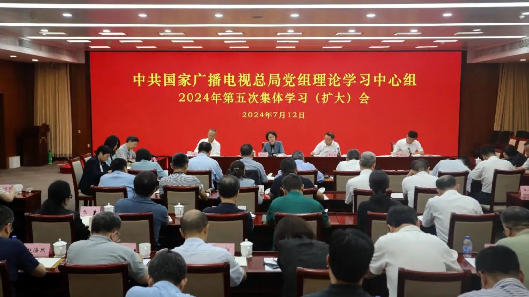 7月12日,國家廣播電視總局黨組理論學習中心組舉行2024年第五次集體學習(擴大)會。中央宣傳部副部長,國家廣播電視總局黨組書記、局長曹淑敏主持會議并講話。會議以深入學習貫徹習近平文化思想、推動廣播電視和網絡視聽高質量發展為主題。廣電總局黨組成員、副局長朱詠雷、董昕、楊國瑞作重點發言,廣電總局機關部門13位主要負責同志作交流發言。