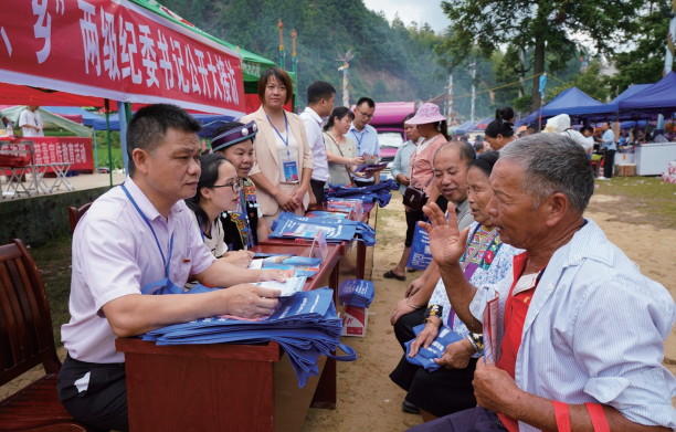 >> 2023年8月2日,廣西融水苗族自治縣紀委監委到紅水鄉良雙苗寨開展縣、鄉兩級紀委書記公開大接訪活動,通過發放資料、傾聽訴求、收集線索等形式,整治鄉村振興領域不正之風和腐敗問題。
