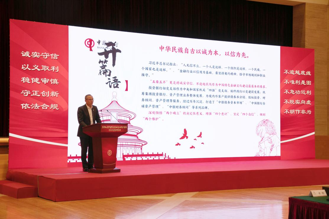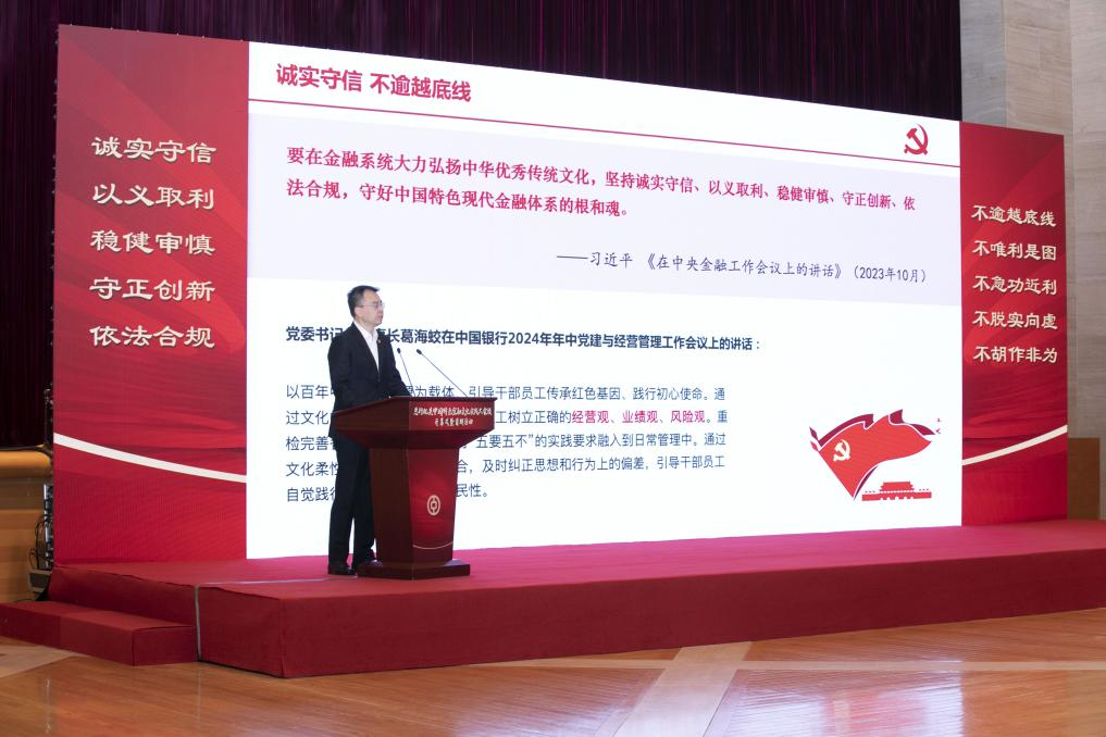 為深入學習貫徹黨的二十屆三中全會精神,認真落實習近平總書記提出的“積極培育中國特色金融文化”重要指示精神,中國銀行于7月26日上午舉辦總行機關“中國特色金融文化實踐大家談”系列活動開幕式暨首期“誠實守信”專題交流展示,黨委班子和管理層成員出席,總行機關各黨支部書記、宣傳委員、黨員代表共200余人參加。