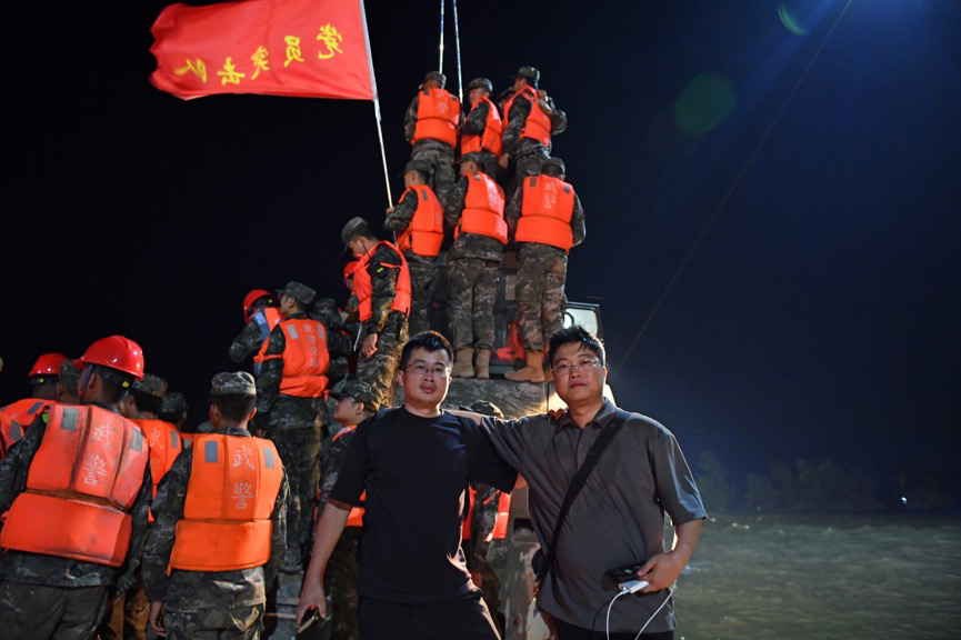 7月8日晚決口封堵后,新華社湖南分社周楠、姚羽在現場留影,身后是慶祝決口勝利封堵的搶險人員。
