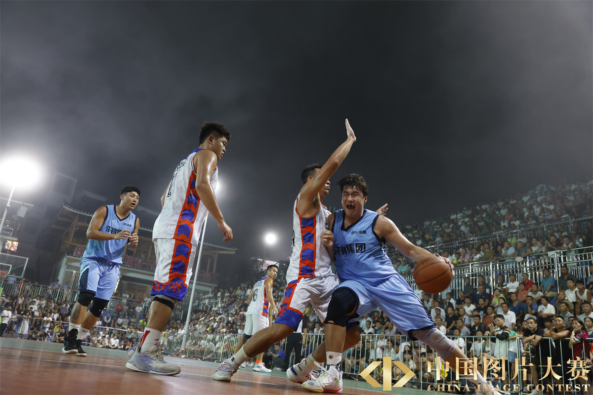 圖2:2023年7月27日,在貴州省黔東南苗族侗族自治州臺江縣臺盤村舉行的村BA比賽中,運動員奮力拼殺。