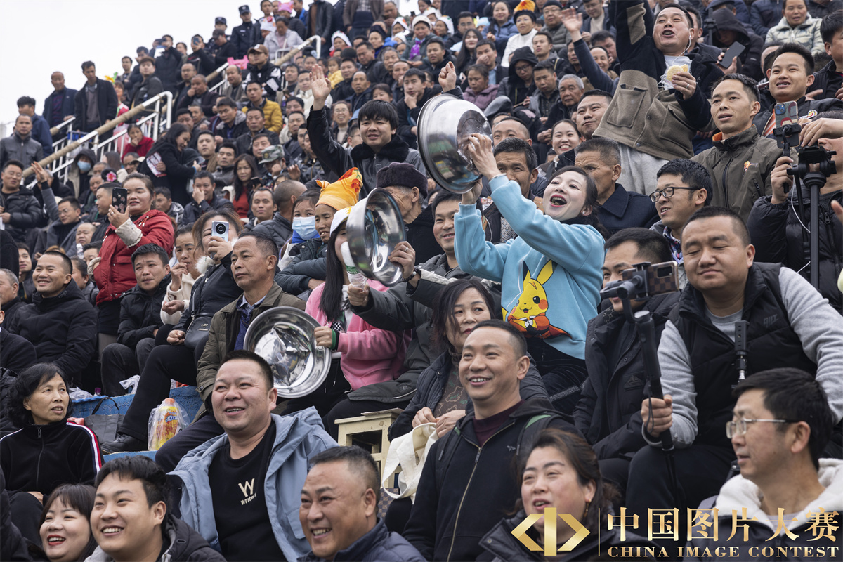 圖7:2023年3月27日,在貴州省黔東南苗族侗族自治州臺江縣臺盤村舉行的村BA比賽中,觀眾拿出自家的不銹鋼盆,為球員吶喊助威。