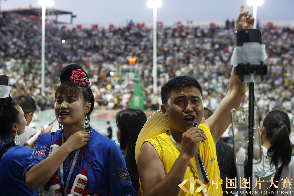 圖10:2023年7月15日,在貴州省黔東南苗族侗族自治州臺江縣臺盤村舉行的村BA比賽中,當地網紅夫婦在直播比賽情況。