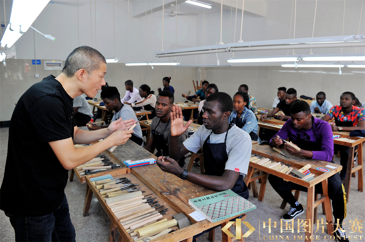 圖1:2019年9月20日,杜飛棟教非洲留學生學習如何選擇和使用雕刻工具。