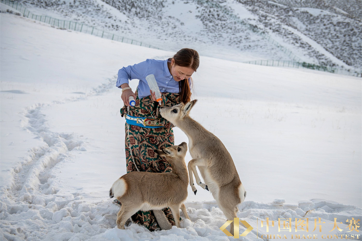 圖4:2018年7月15日,在青海省海西州都蘭縣溝,仁增多杰教侄女更桑拉毛為救助的藏原羚喂食。