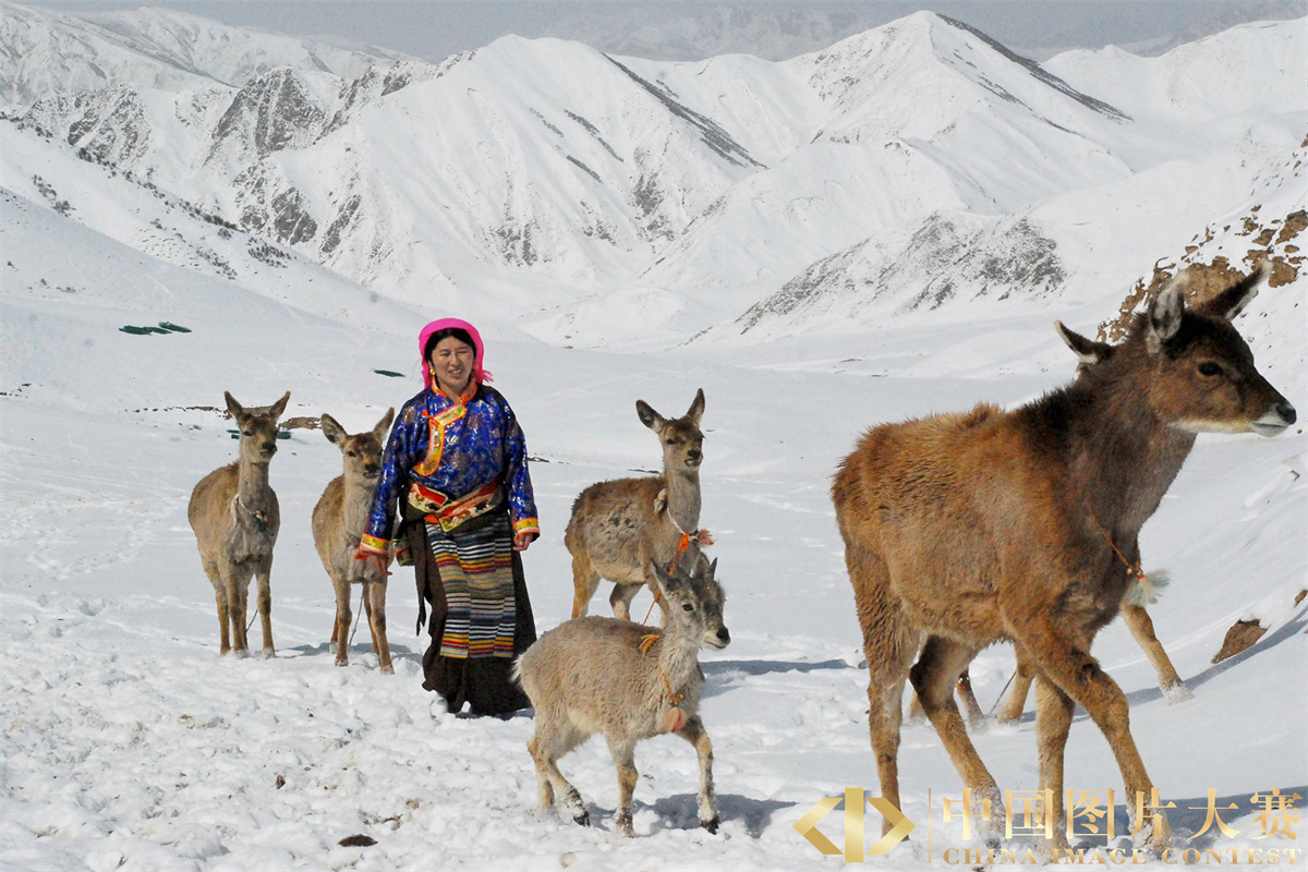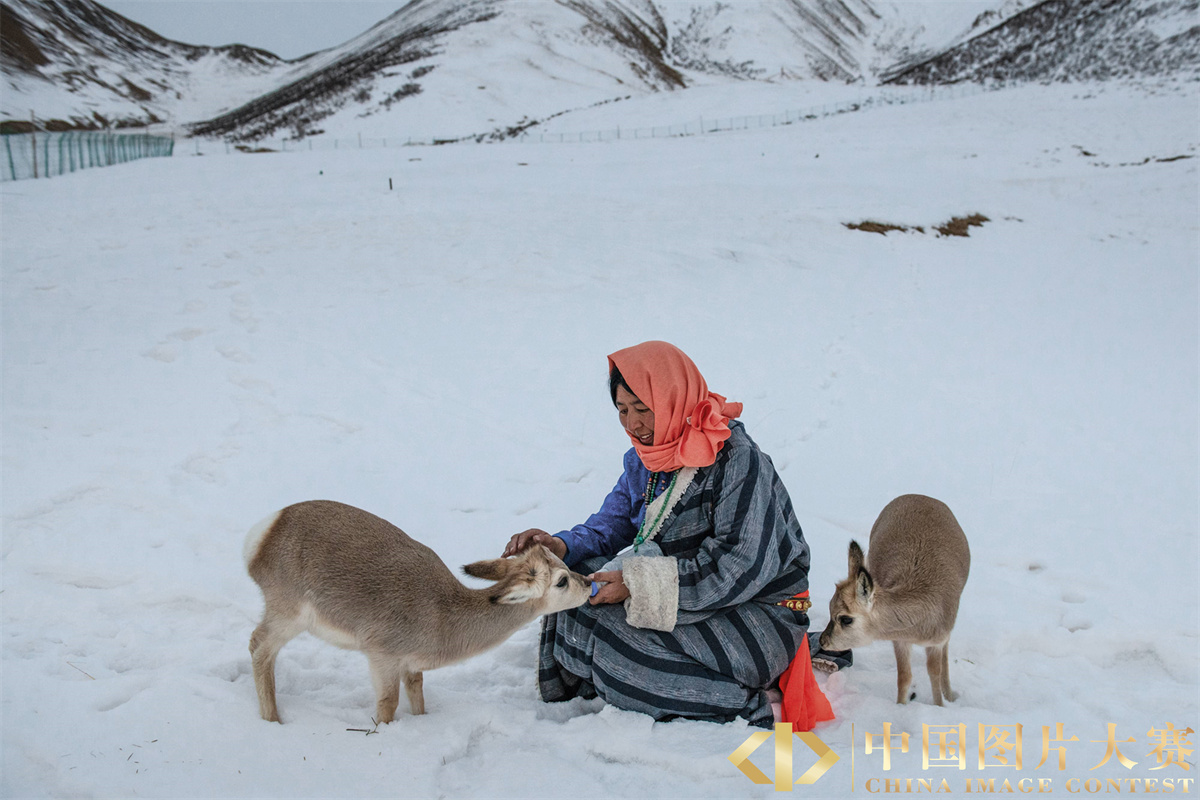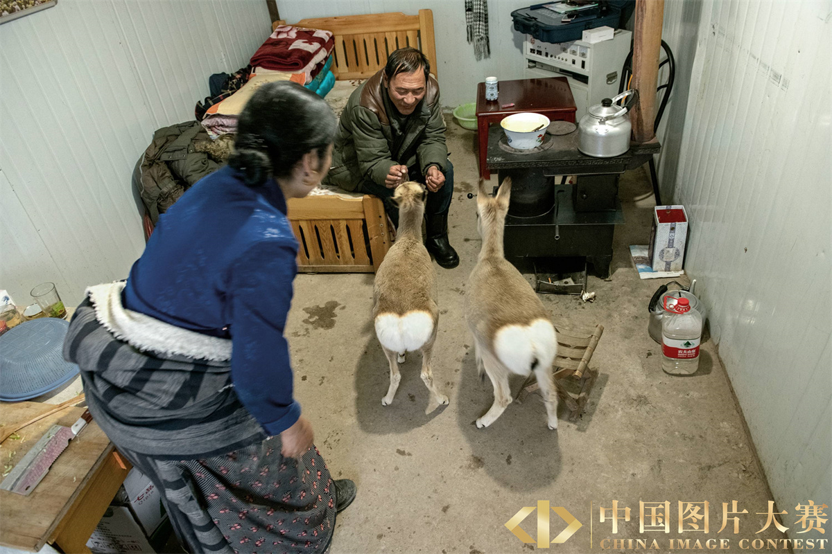 圖2:2018年11月30日,在青海省海西州都蘭縣溝,仁增多杰和妻子德措吉與救助的藏原羚在家嬉戲。
