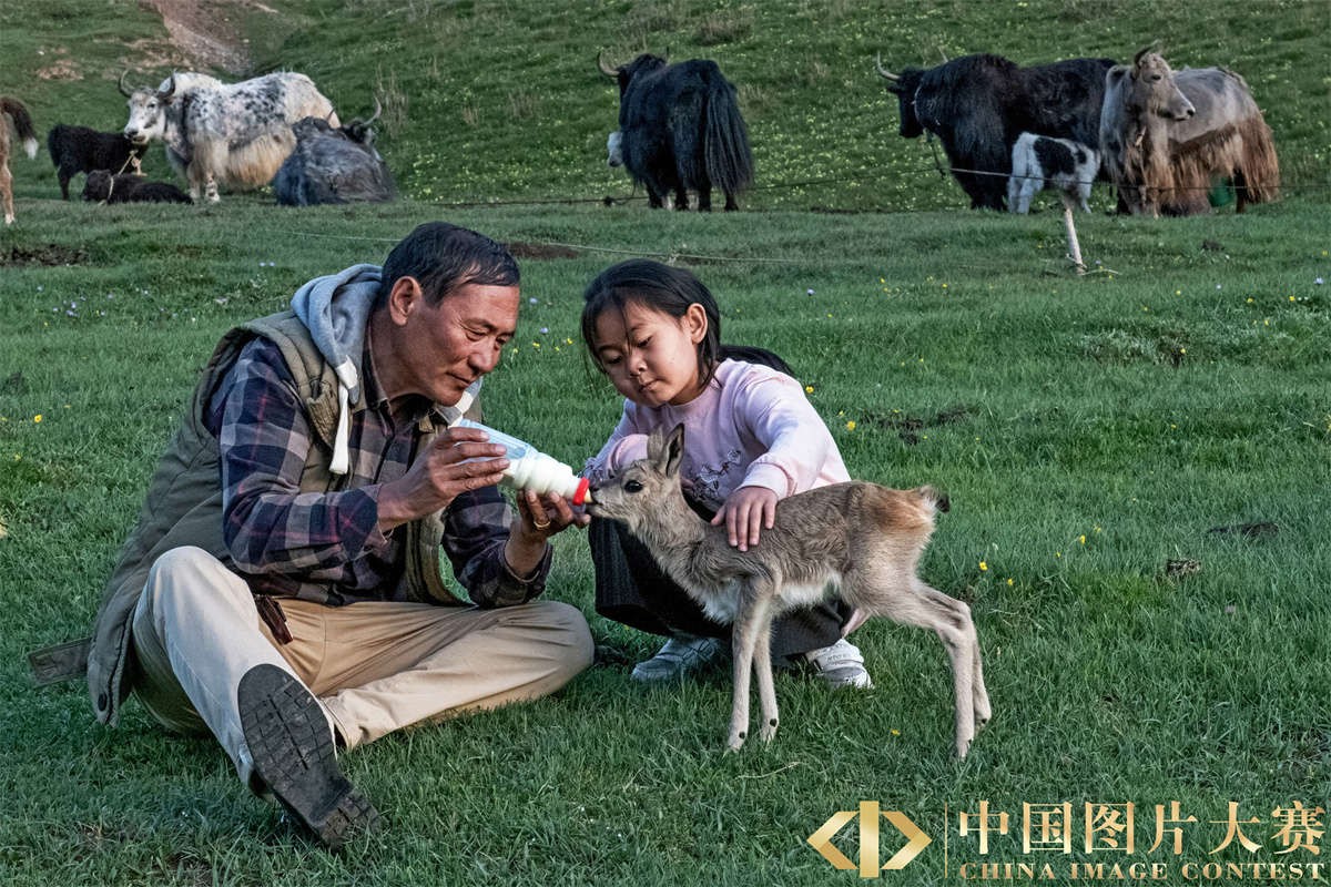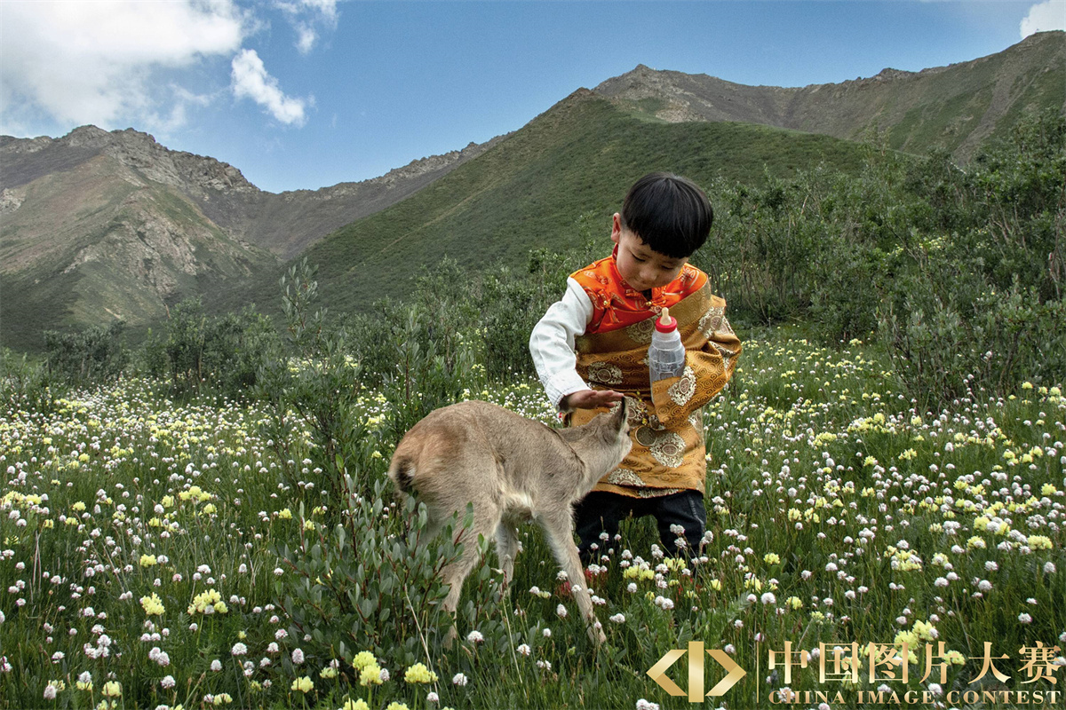 圖10:2018年7月24日,在青海省海西州都蘭縣溝,仁增多杰的孫子與藏原羚一起玩耍。
