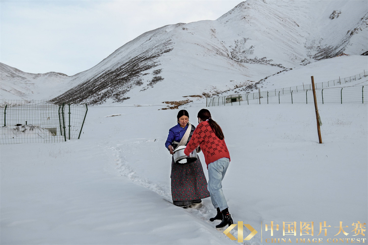 圖5:2018年12月2日,在青海省海西州都蘭縣溝,德措吉和女兒仁青拉毛抬雪化水做飯。