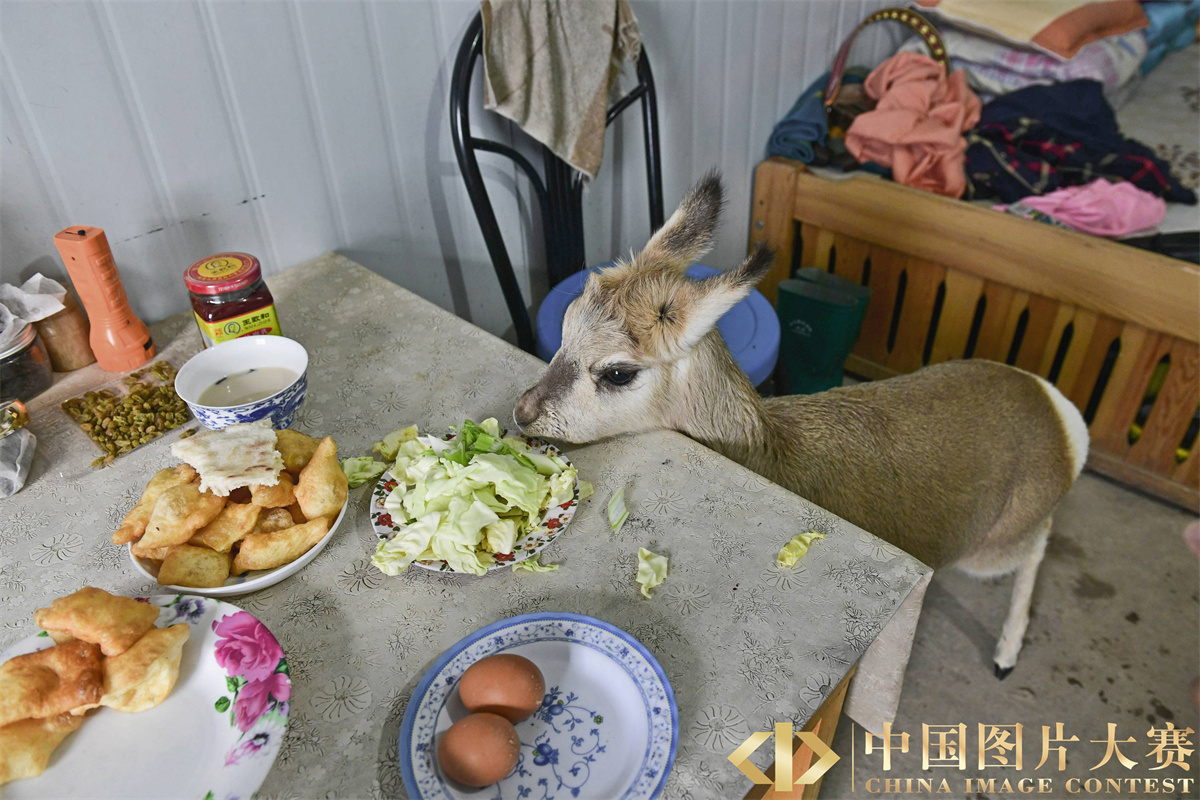 圖6:2018年12月1日,在青海省海西州都蘭縣溝,藏原羚和主人一起在餐桌用餐。
