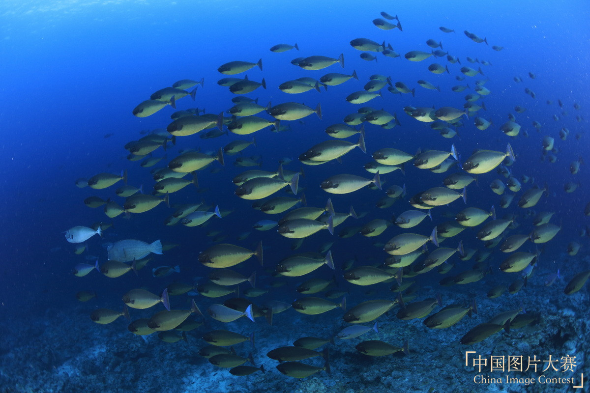 圖1:大群的刺尾鼻魚迎著海流,游弋在中建島的珊瑚礁周圍。