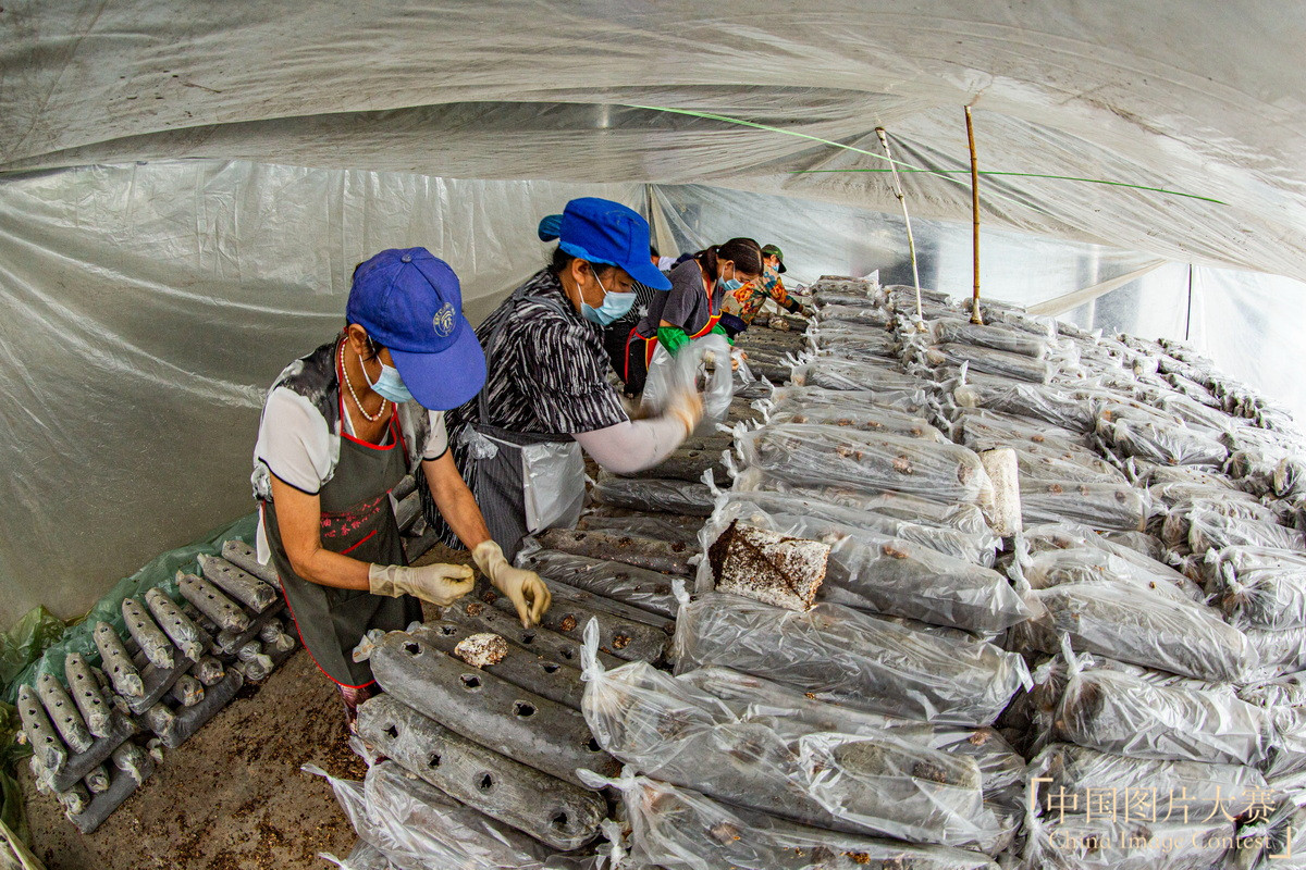 圖4:2021年9月5日,村民在給菌棒點菌種。