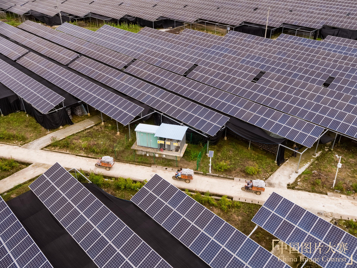 圖5:2021年9月2日,村民在光伏板下運送菌棒。