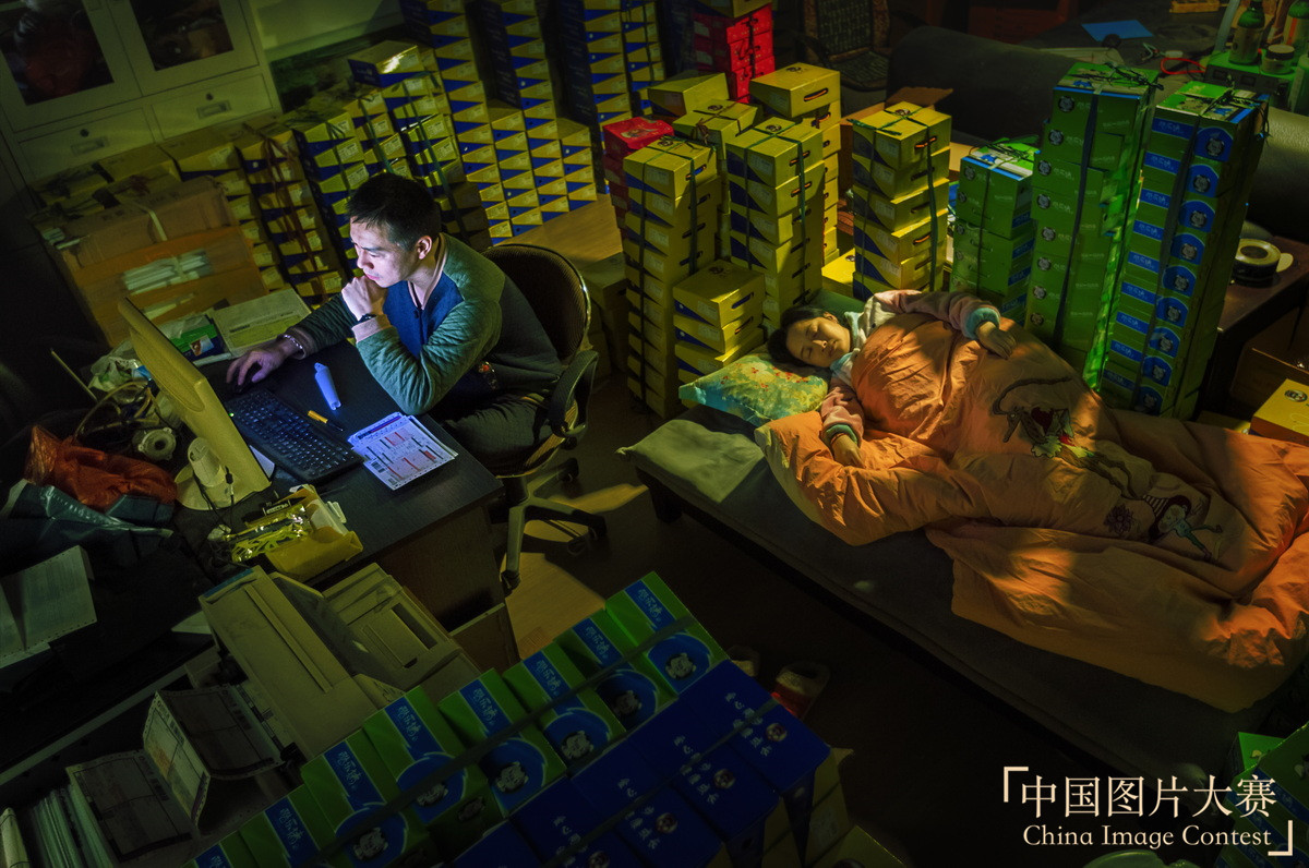 圖3:2014年11月12日凌晨1點,忙碌了一整天的趙先生仍在打理網上業務,妻子躺在身后的簡易床上睡著了。