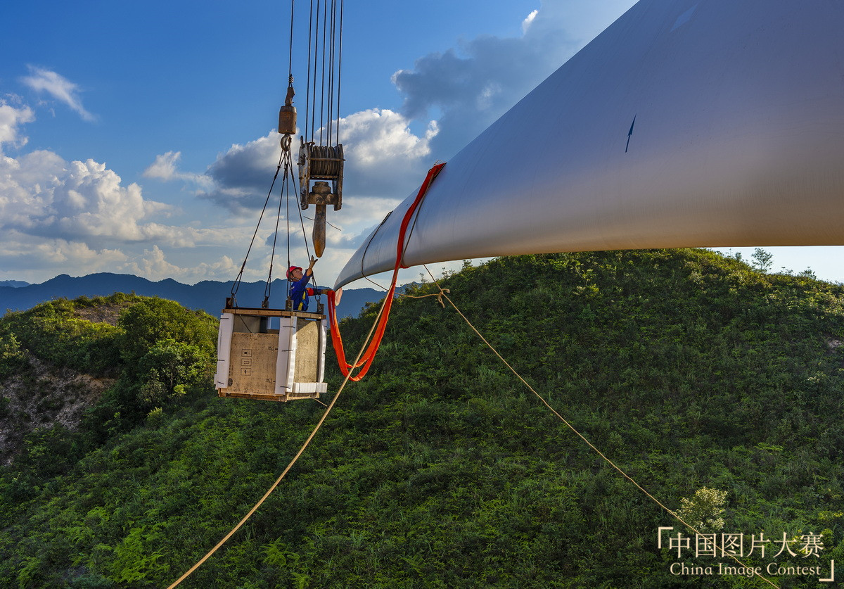 圖2:2018年6月26日,漳平市紅尖山風電場19號機施工現場,風機槳葉與輪轂對接。
