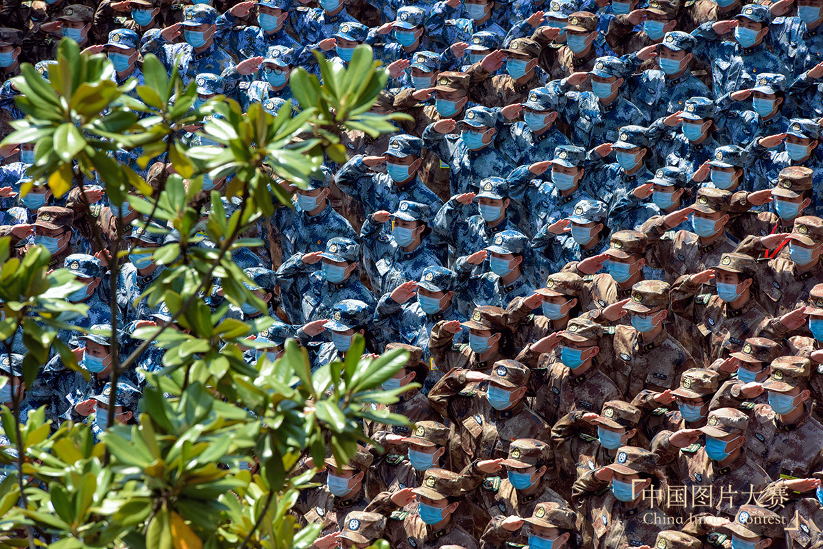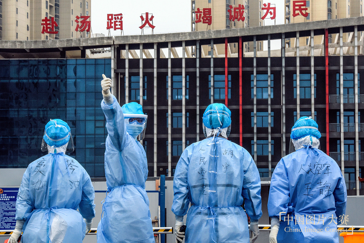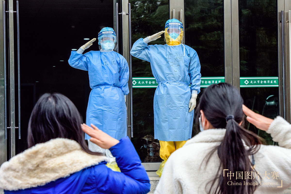 圖6:2020年4月15日,在武漢火神山醫院,軍隊支援湖北醫療隊隊員敬禮告別。