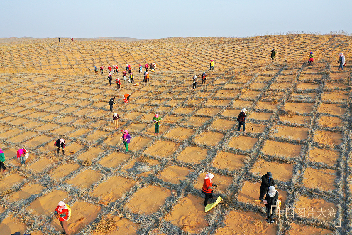 圖4:2020年11月12日,村民和志愿者在沙漠里集體治沙。