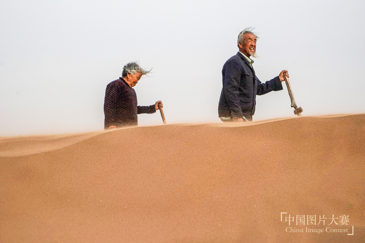 圖2:2020年4月17日,王天昌和妻子李藍英步入騰格里沙漠,開始一天的治沙造林工作。