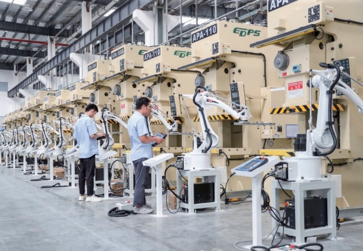 >> 2024年7月26日,在四川廣安華鎣市華鎣山經開區,四川怡田科技有限公司員工在智能車間調試新安裝的機器人。