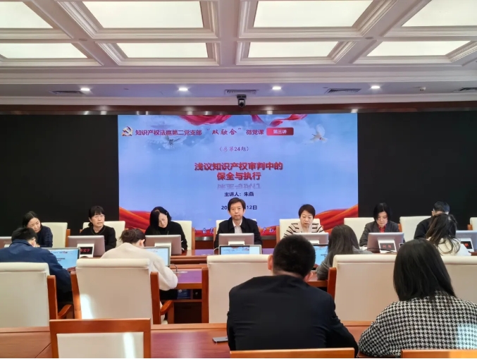 2023年11月12日,黨小組組長朱燕講授《淺議知識產權審判中的保全與執行》的微黨課。