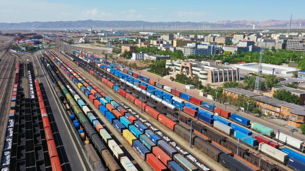 2024年5月25日,在新疆阿拉山口站寬準軌編組場,出入境中歐班列集結等待出發(無人機照片)。新華社發(于暉 攝)