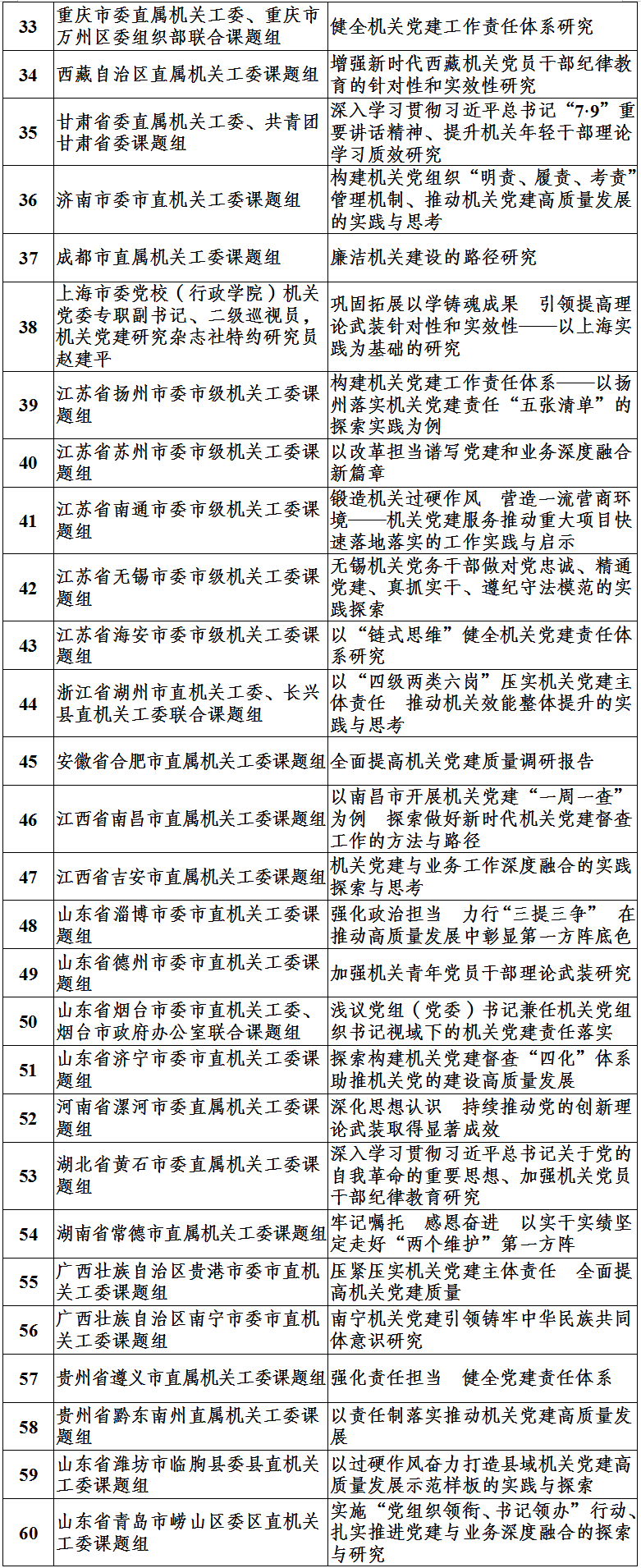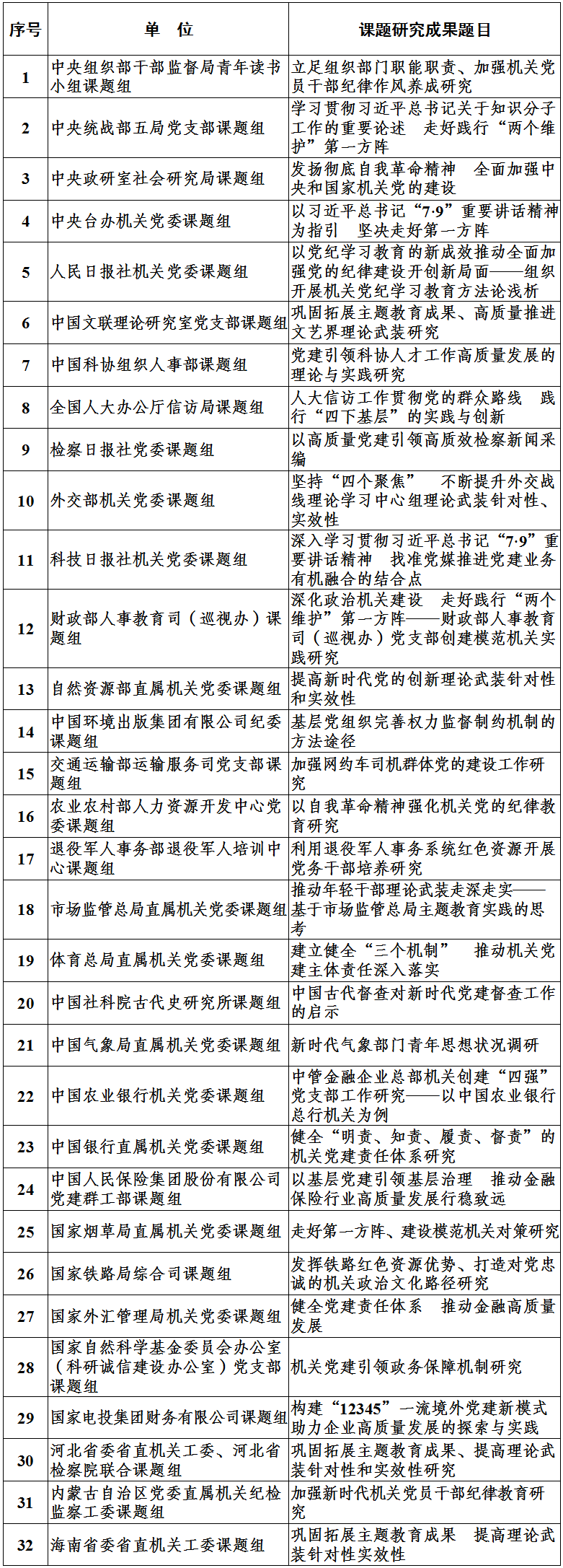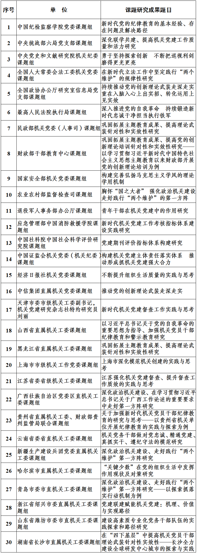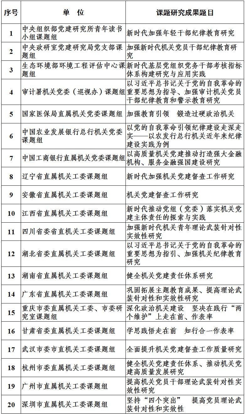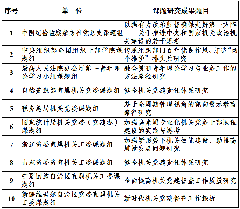 為深入學習貫徹習近平新時代中國特色社會主義思想和黨的二十大精神,認真貫徹落實黨的二十屆三中全會精神,貫徹落實習近平總書記關于黨的建設的重要思想、關于黨的自我革命的重要思想,特別是關于機關黨建的重要講話和重要指示精神,扎實推進機關黨建理論研究工作,助力全面提高機關黨建質量,中央和國家機關工委機關黨建研究雜志社組織開展了2024年度課題研究工作。今年,共收到中央和國家機關各部門、地方各級機關黨組織、機關黨建研究雜志社特約研究員報送的課題研究成果347篇。按照公平公正原則進行了初評和復評,經中央和國家機關工委審定,評選出一等獎10篇、二等獎20篇、三等獎30篇、優秀獎60篇,優秀組織獎10個。
