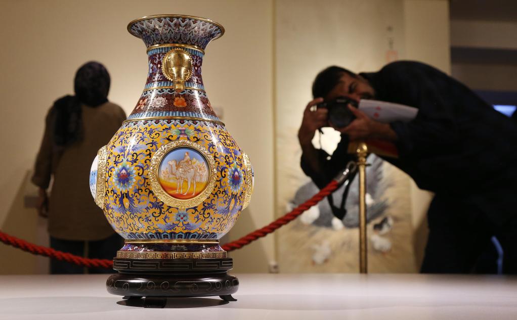 2024年10月12日,在伊朗首都德黑蘭的馬利克國家博物館,觀眾在“絲路長云——中國藝術文化精品展”現場拍攝展品。新華社記者 沙達提 攝